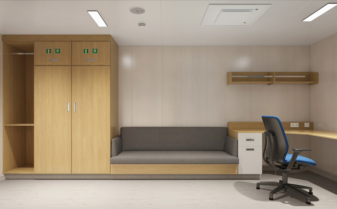 स्वच्छता इकाइयों, फर्नीचर और अन्य फिटिंग के साथ पूर्वनिर्मित मॉड्यूलर केबिन यूनिट
